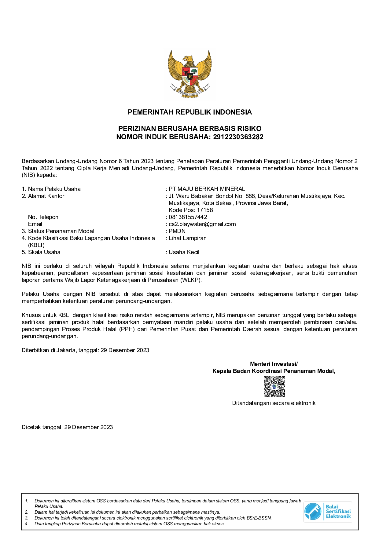 PT Maju Berkah Mineral adalah perusahaan yang bergerak di bidang industri air minum dalam kemasan, dengan jaminan produk air minum yang higenis, aman dan menyehatkan.